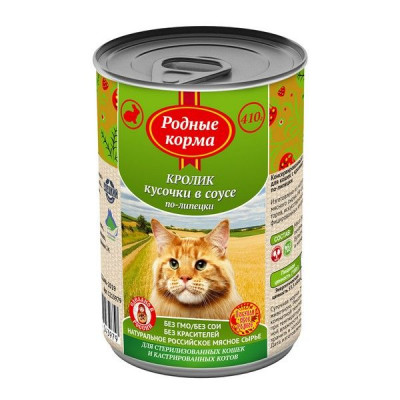 РОДНЫЕ КОРМА КОРМ ВЛАЖН. Д/КОШЕК КРОЛИК КУСОЧКИ В СОУСЕ ПО-ЛИПЕЦКИ 410Г. Б/КРЫШКИ (ВЕТ.)